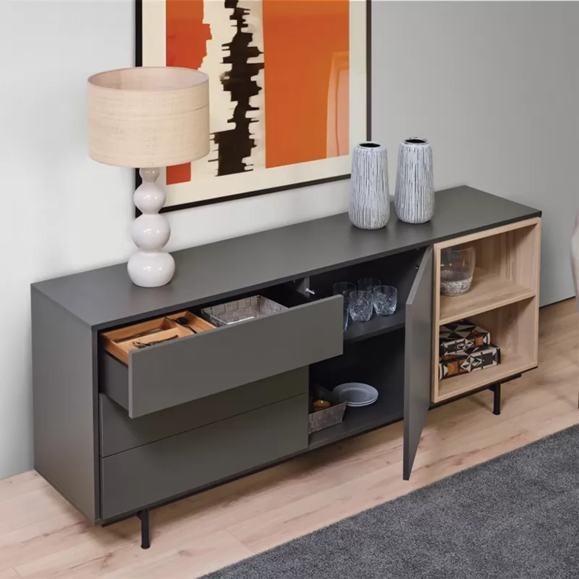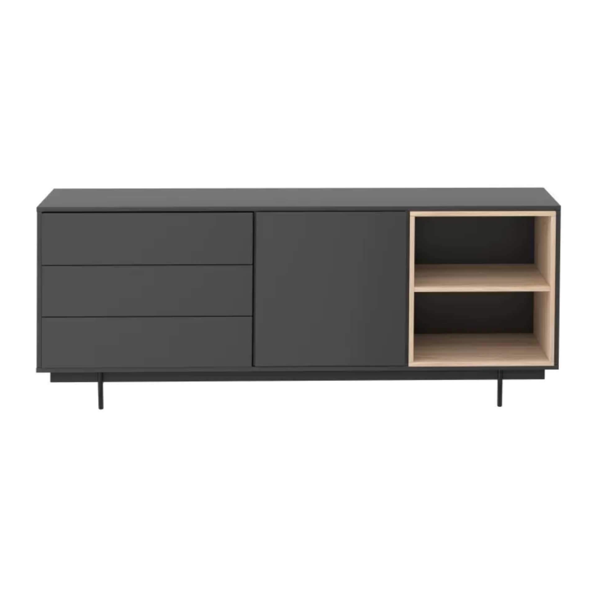 Home Aparadores Aparador Malmo Lourini Aparador Malmo Lourini SKU: 001699474 558,00 € Desconto de %. Comprar Contactar Adicionar à wishlist Aparador Malmo com 3 gavetas, 1 portas e espaço aberto com uma prateleira. Disponível em 3 cores: Dark grey (cor da foto), branco ou capuccino. Dimensões: Comprimento: 2.00m; Profundidade: 0.46m; Altura: 0.80m. Materias e acabamentos: Melamina dark grey e carvalho; Pé metálico preto. Partilhar