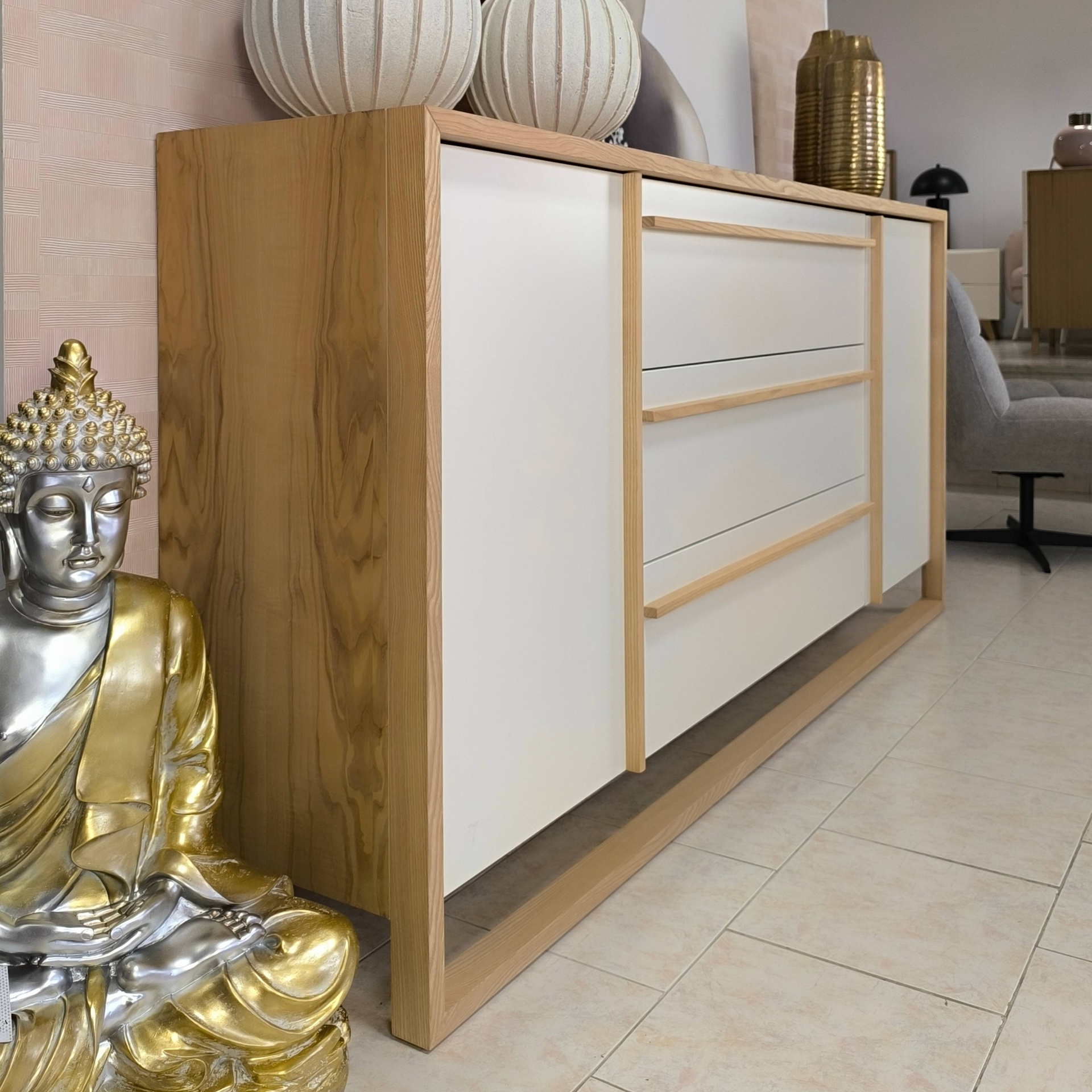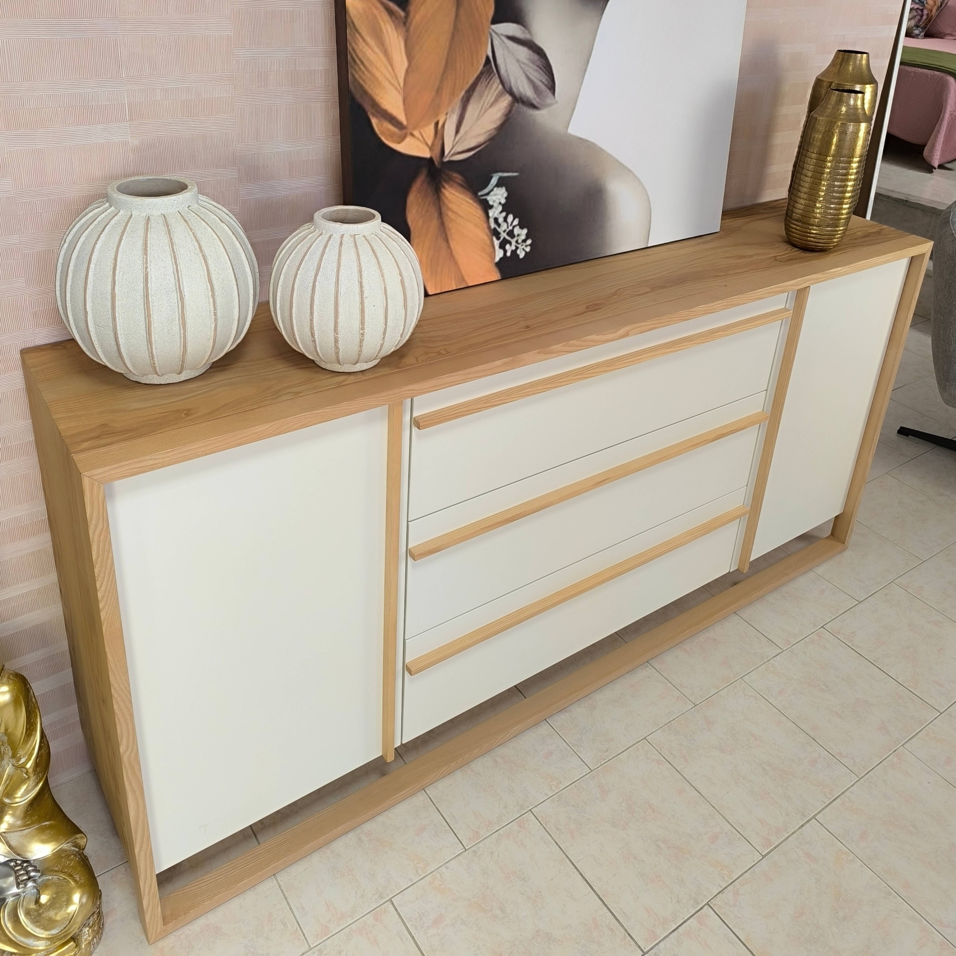 Home Aparadores Aparador Oikos Aparador Oikos SKU: 081213001 1.295,00 € Desconto de %. Comprar Contactar Adicionar à wishlist Aparador Oikos com ótima arrumação, com 3 gavetas e 2 portas. Tem ainda um design diferenciado e uma combinação de acabamentos elegante. Dimensões: Comprimento: 2.00m; Profundidade: 0.40m; Altura: 0.95m. Materias e acabamentos: Madeira de freixo; MDF lacado branco pérola. *Disponível no showroom. Tags Showroom Características Partilhar