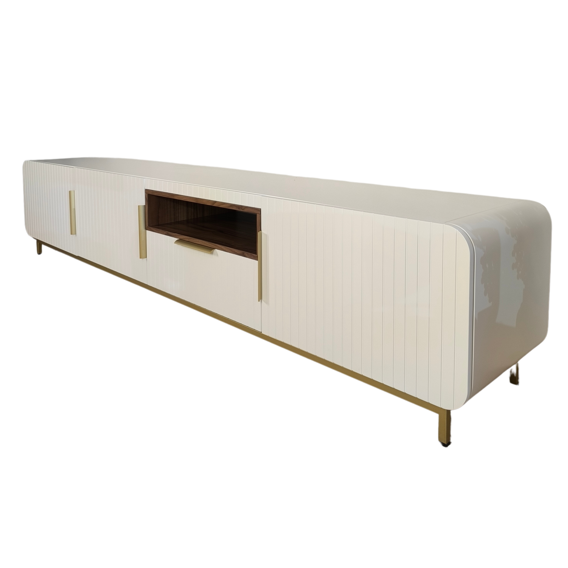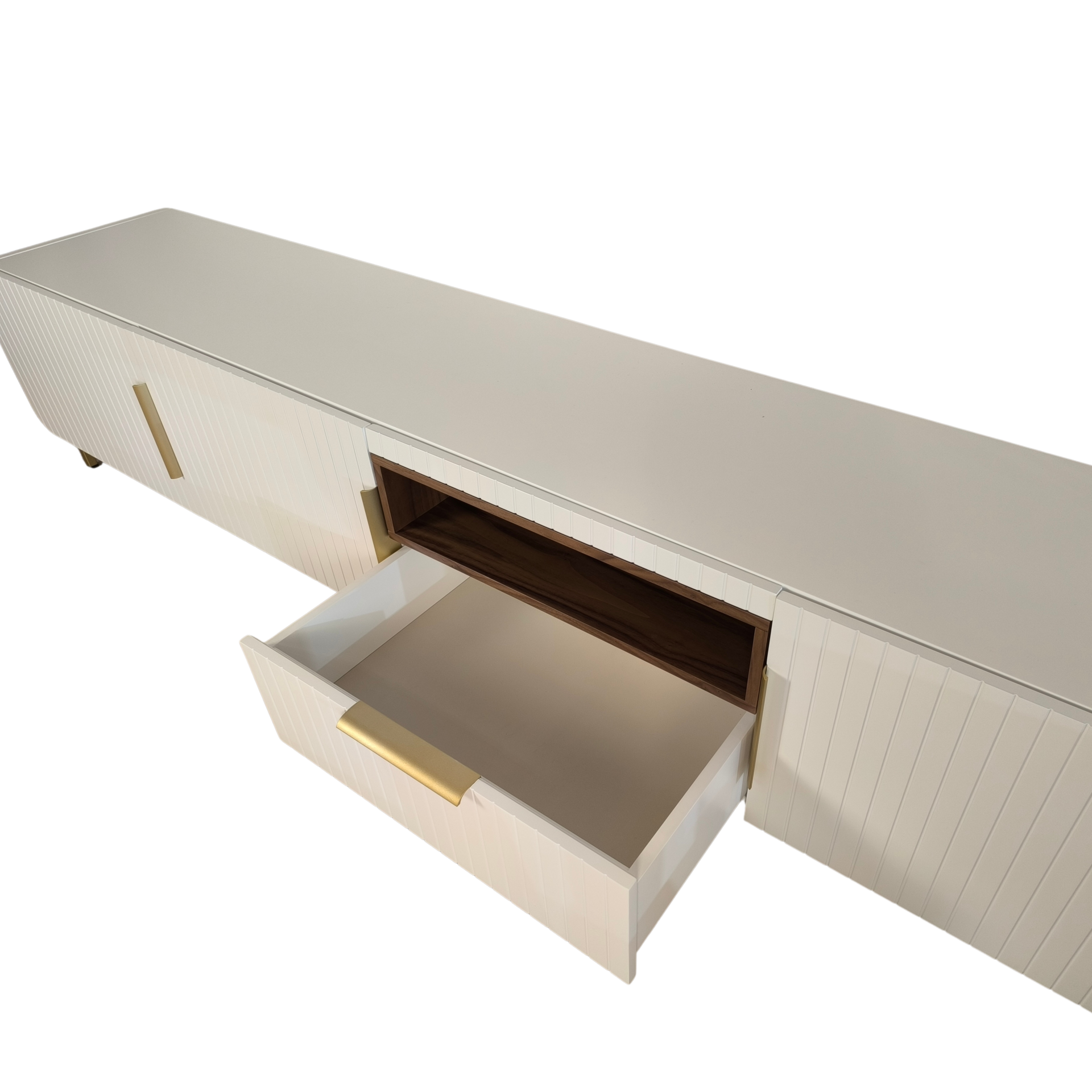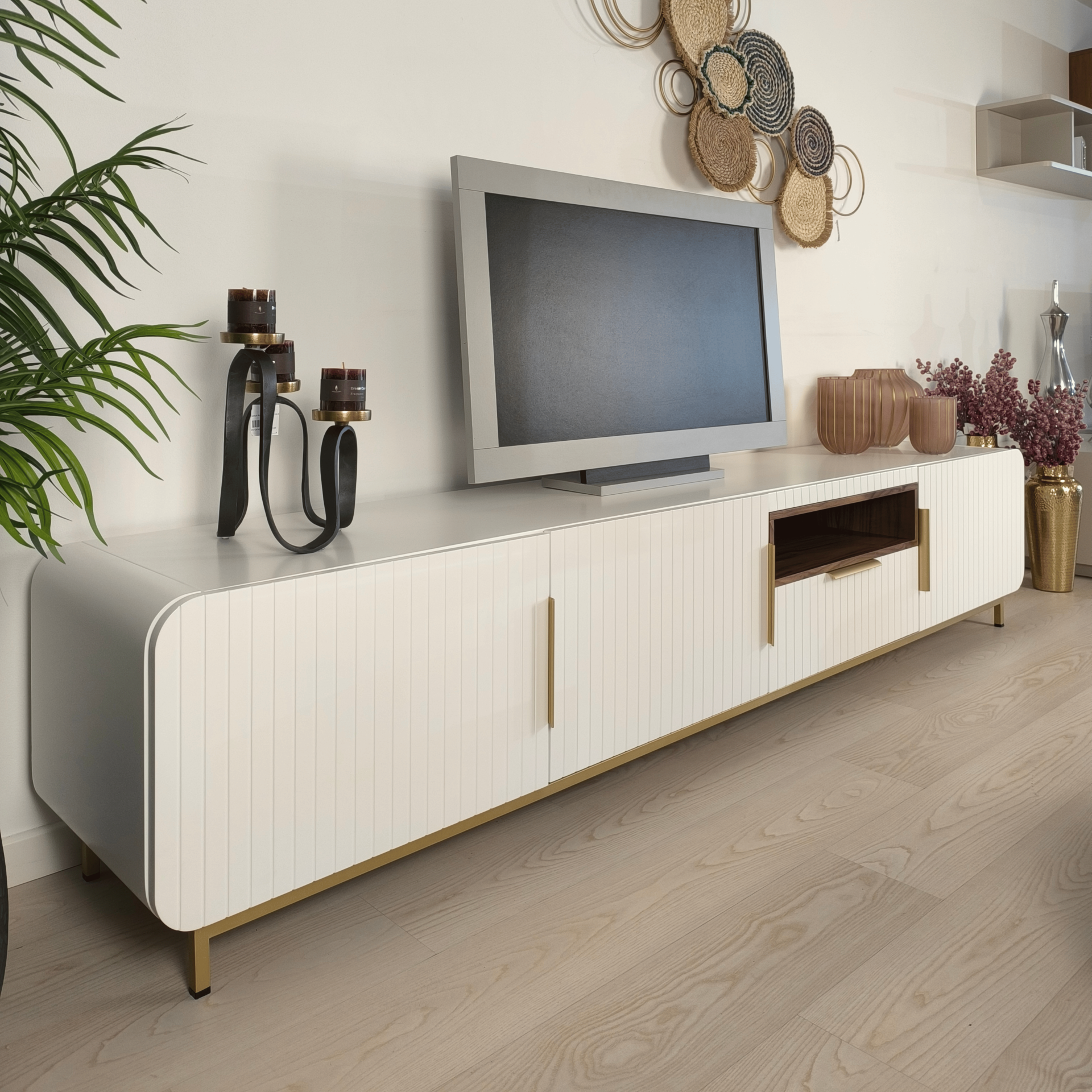 Home Móveis tv Base tv Gepeto Base tv Gepeto SKU: 083035001 1.340,00 € Desconto de %. Comprar Contactar Adicionar à wishlist Móvel tv Gepeto, com pé e puxadores metálicos dourado, estrutura em lacado branco mate e pormenor em nogueira. Possui três portas, uma gavetas e zona aberta para a box tv. Dimensões: 2.50m x 0.45m x 0.50m * Para outras cores ou revestimentos solicite orçamento. *Disponível no nosso showroom Partilhar