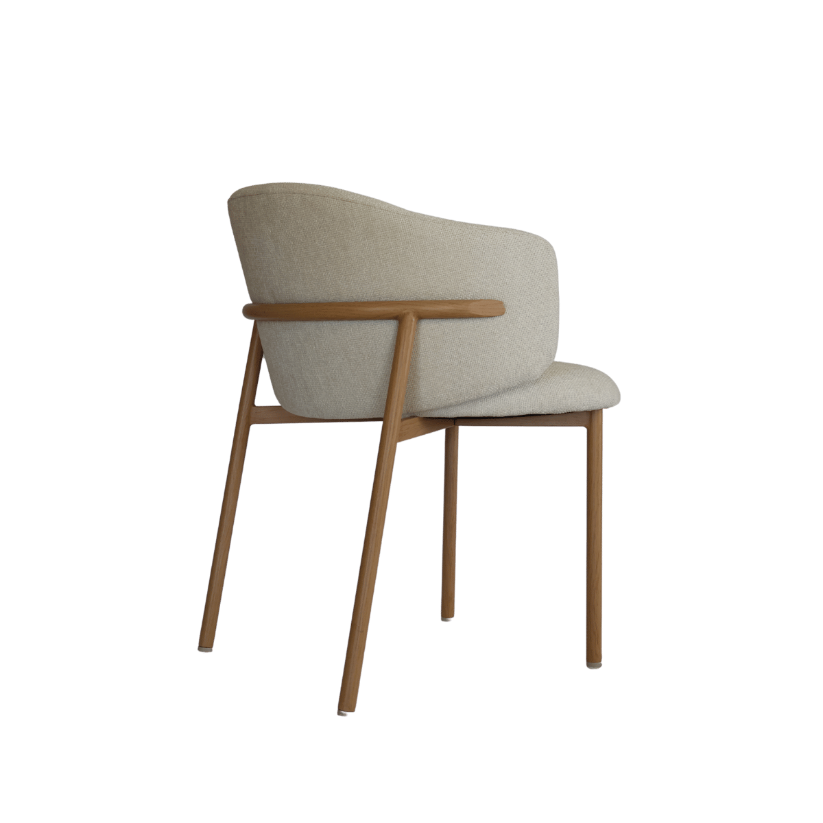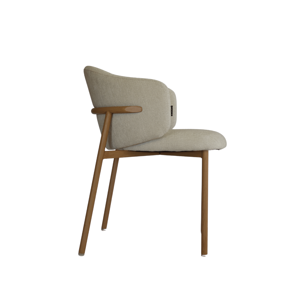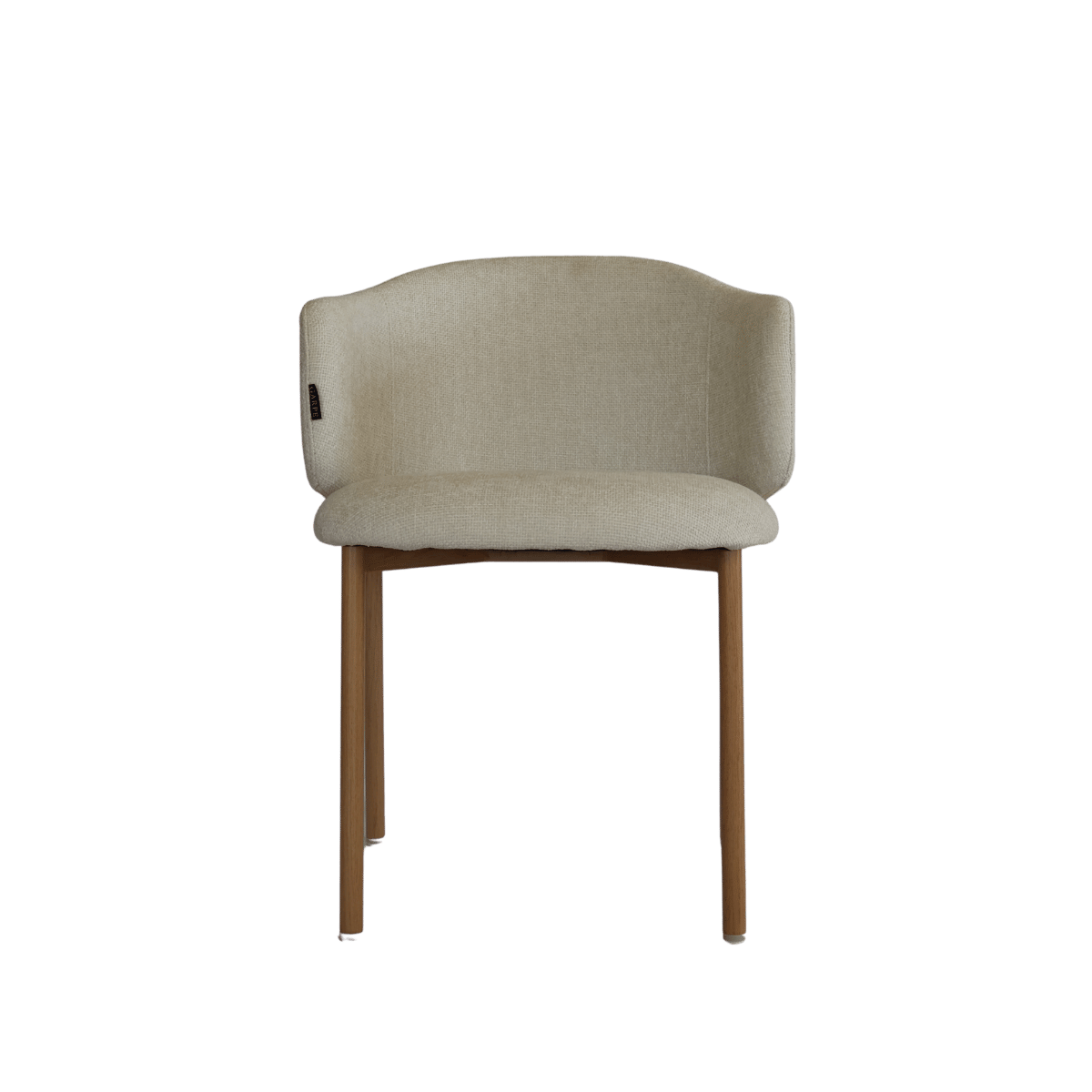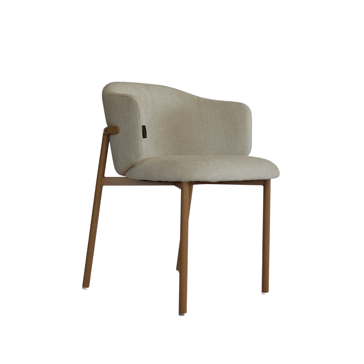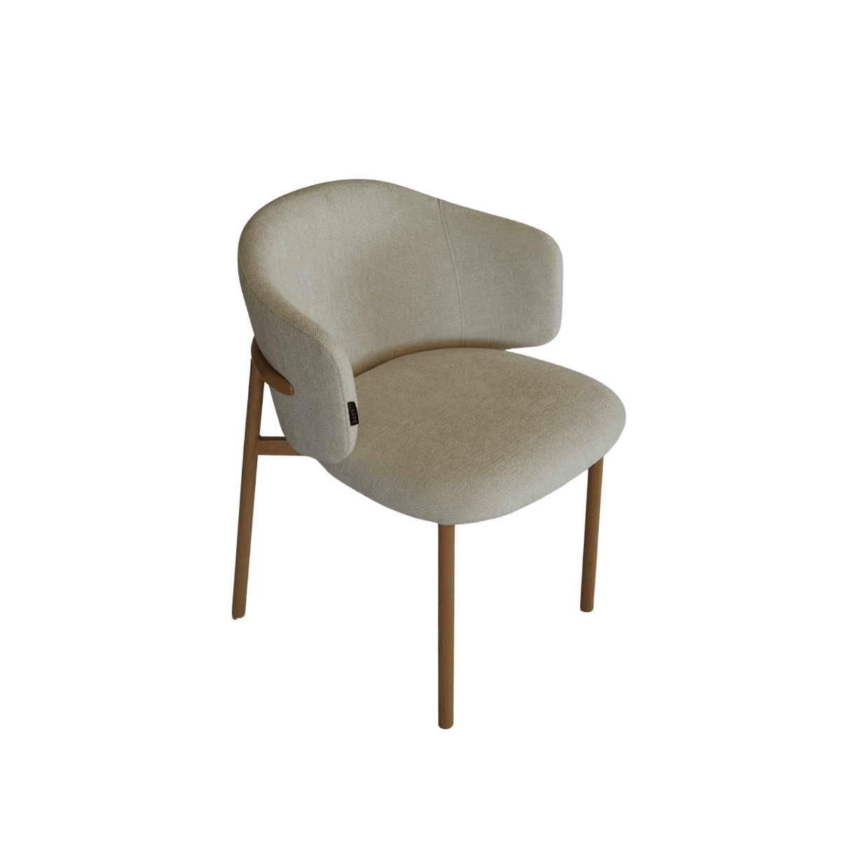 Cadeira estofada de design moderno com encosto curvo envolvente, ideal para sala de jantar, escritório ou espaço de refeição contemporâneo. O revestimento em tecido de toque suave no elegante tom bege cria um ambiente acolhedor e sofisticado.