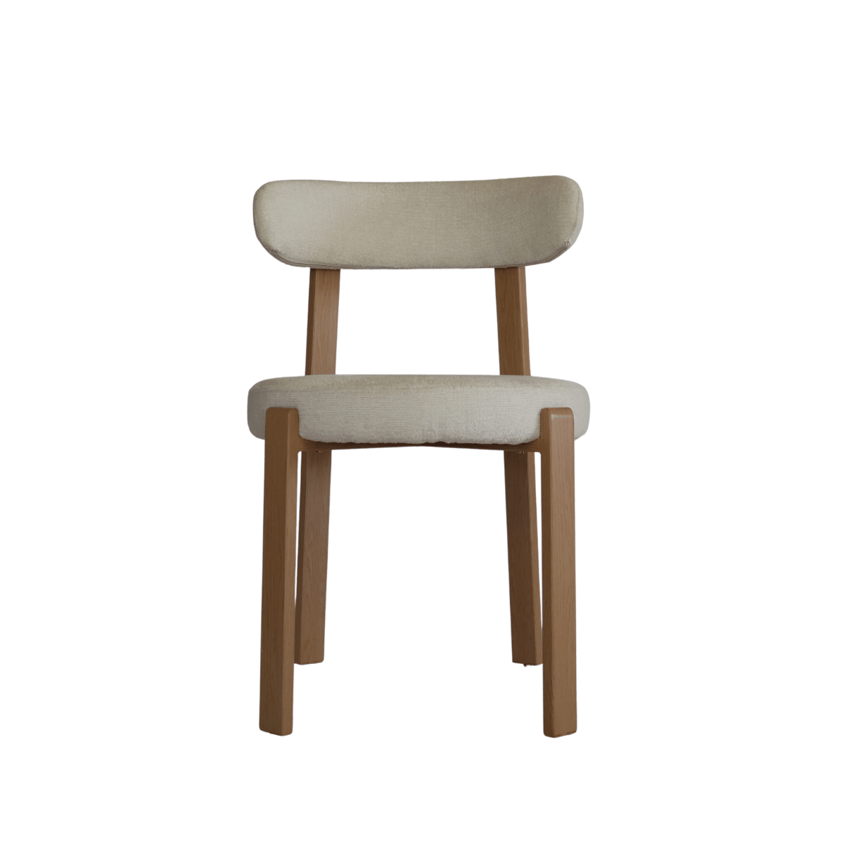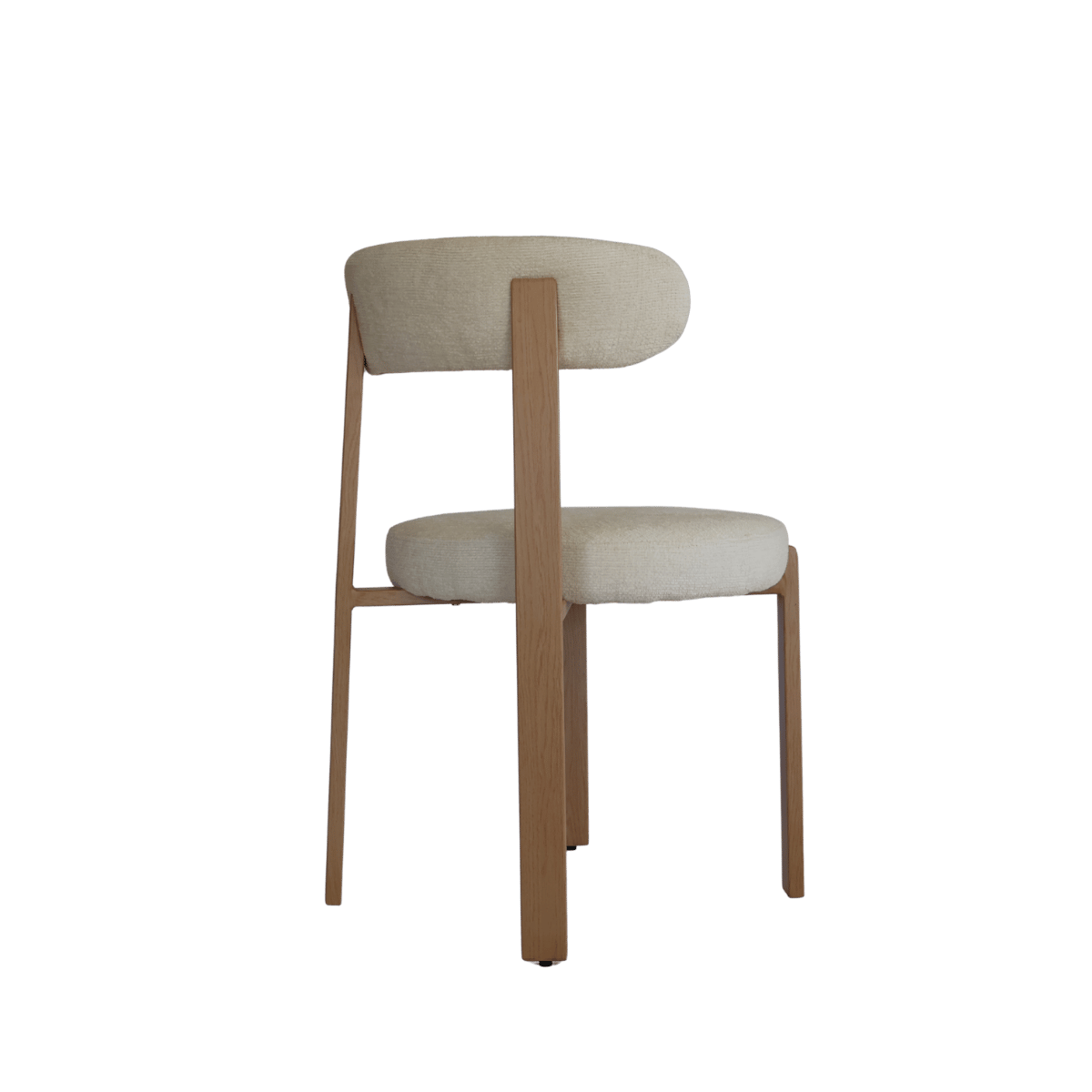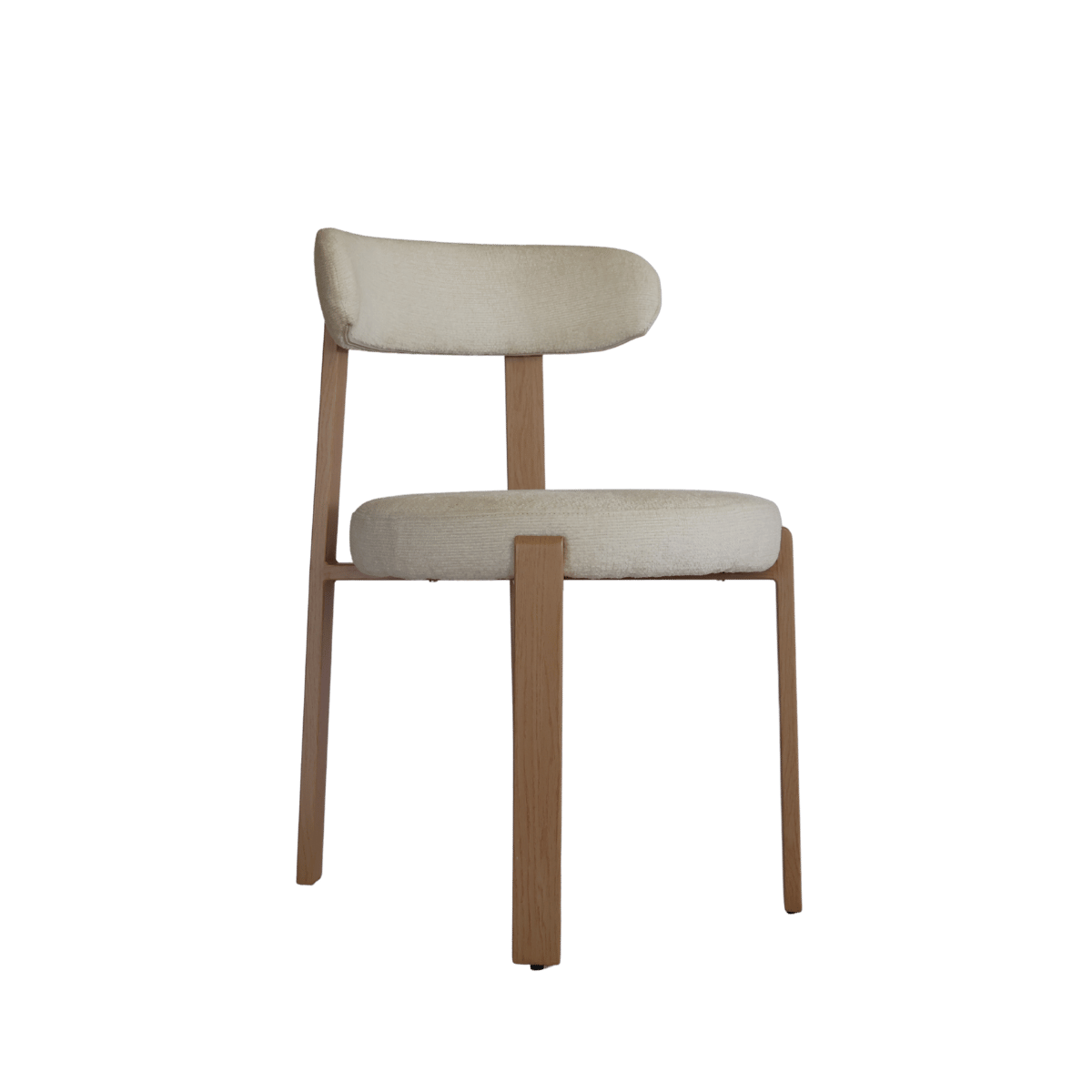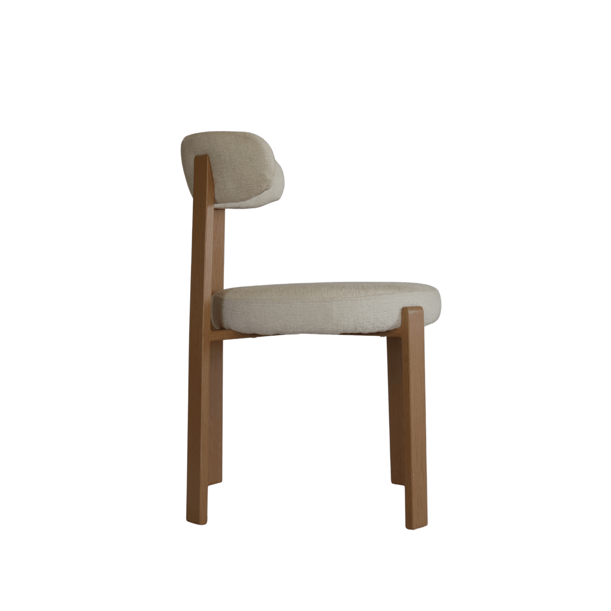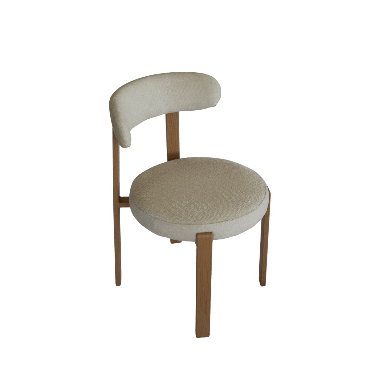 Cadeira estofada de design moderno com encosto curvo envolvente, ideal para sala de jantar, escritório ou espaço de refeição contemporâneo. O revestimento em tecido de toque suave no elegante tom bege cria um ambiente acolhedor e sofisticado.