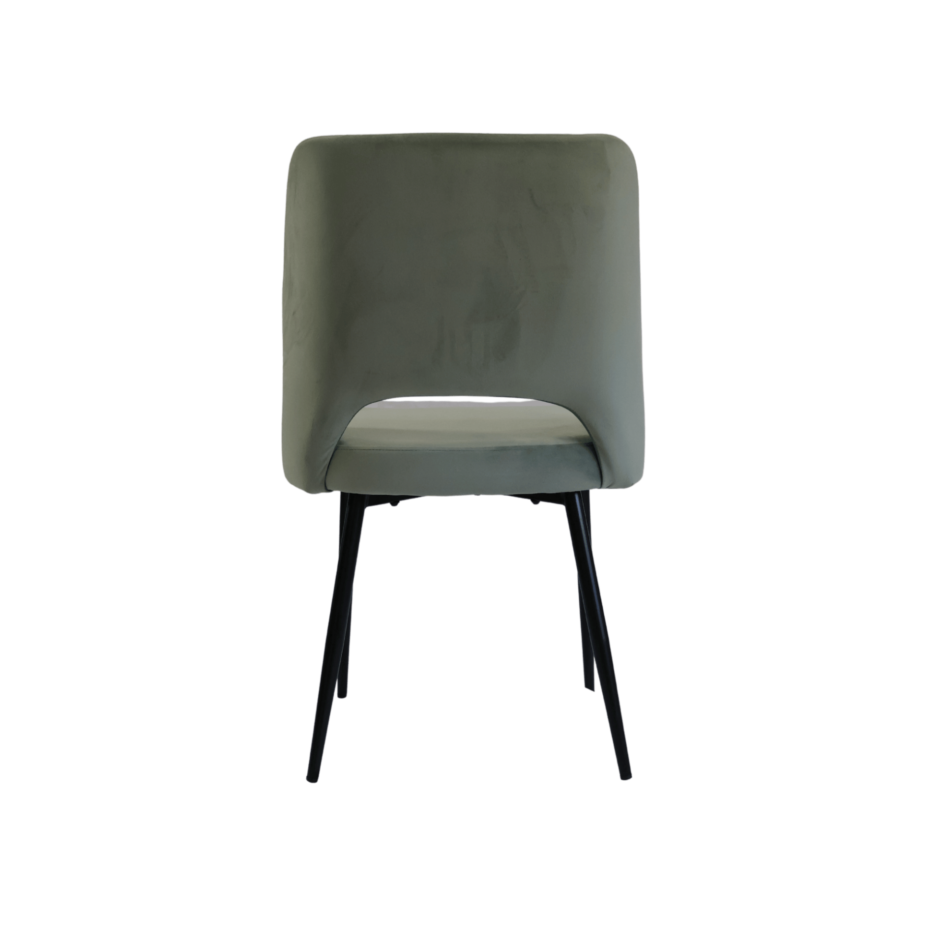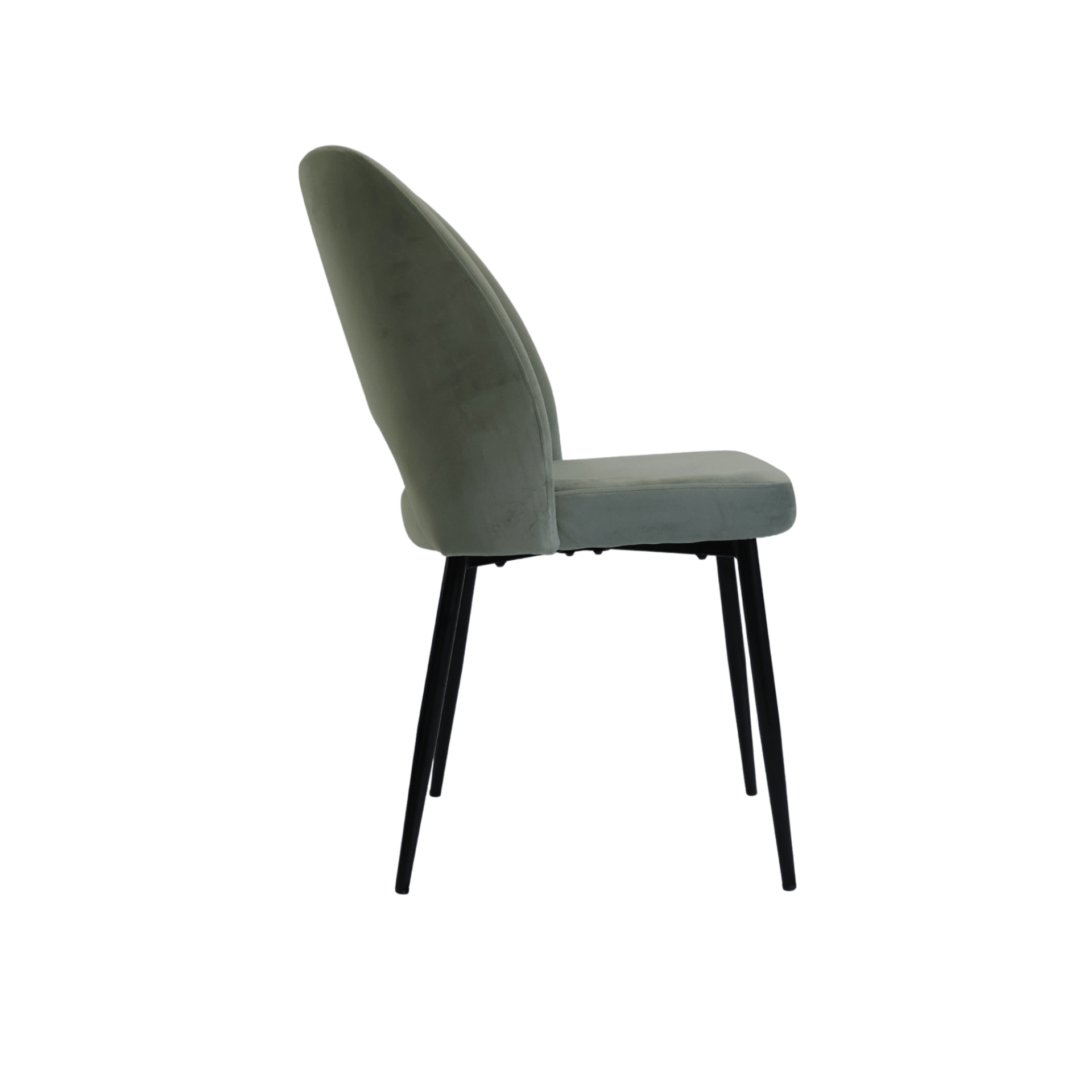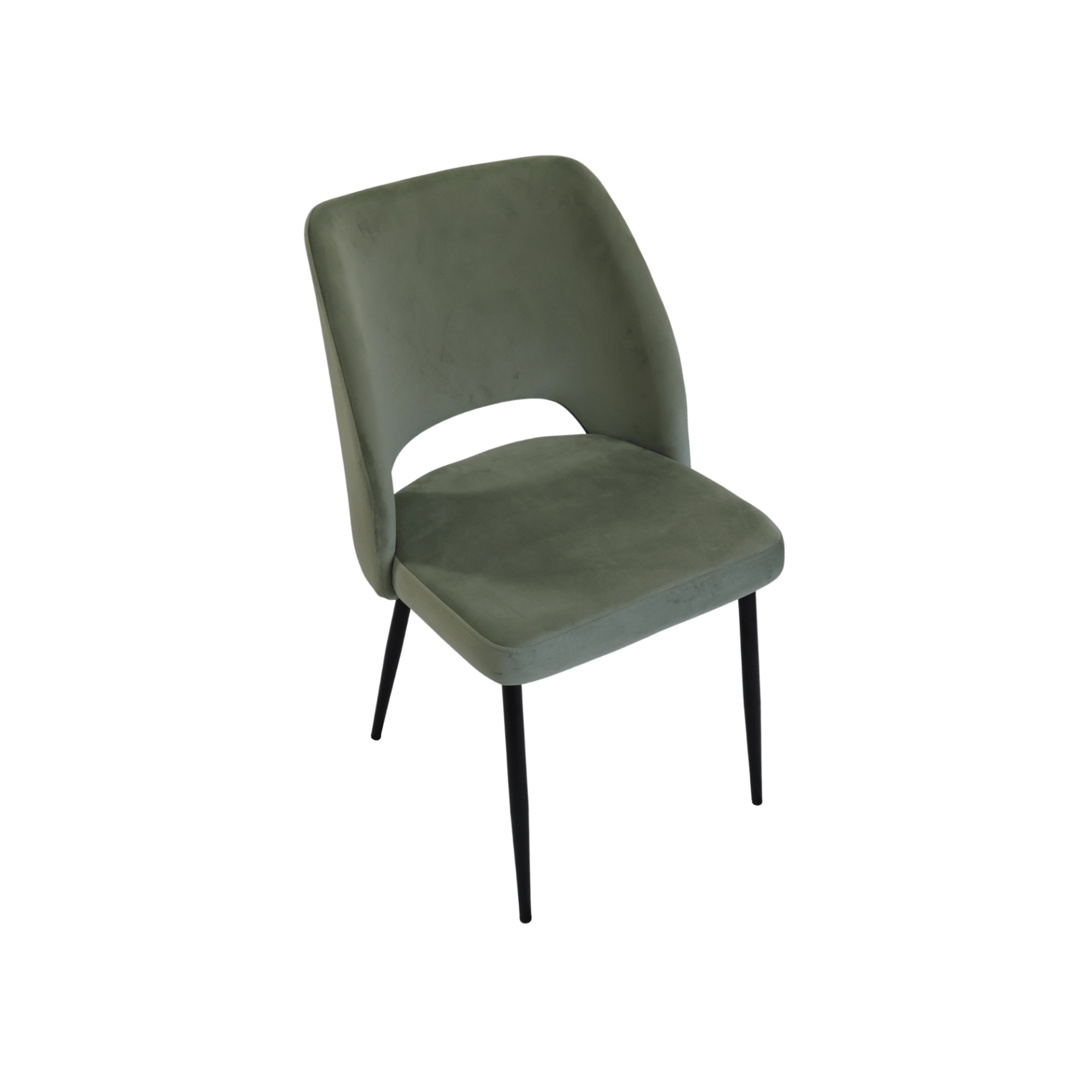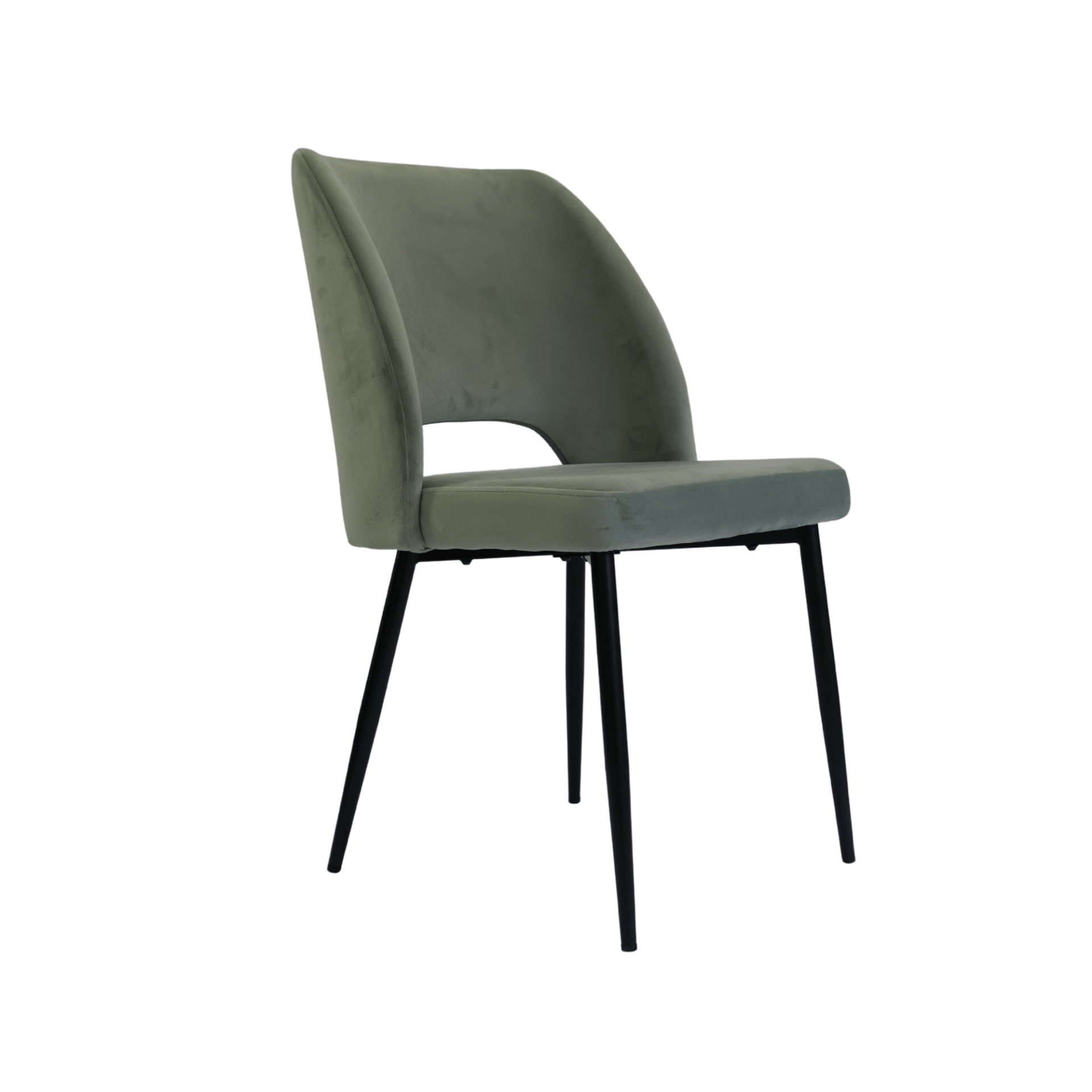 Cadeira estofada de design moderno com encosto curvo envolvente, ideal para sala de jantar, escritório ou espaço de refeição contemporâneo. O revestimento em tecido de veludo de toque suave no elegante tom verde cria um ambiente acolhedor e sofisticado.