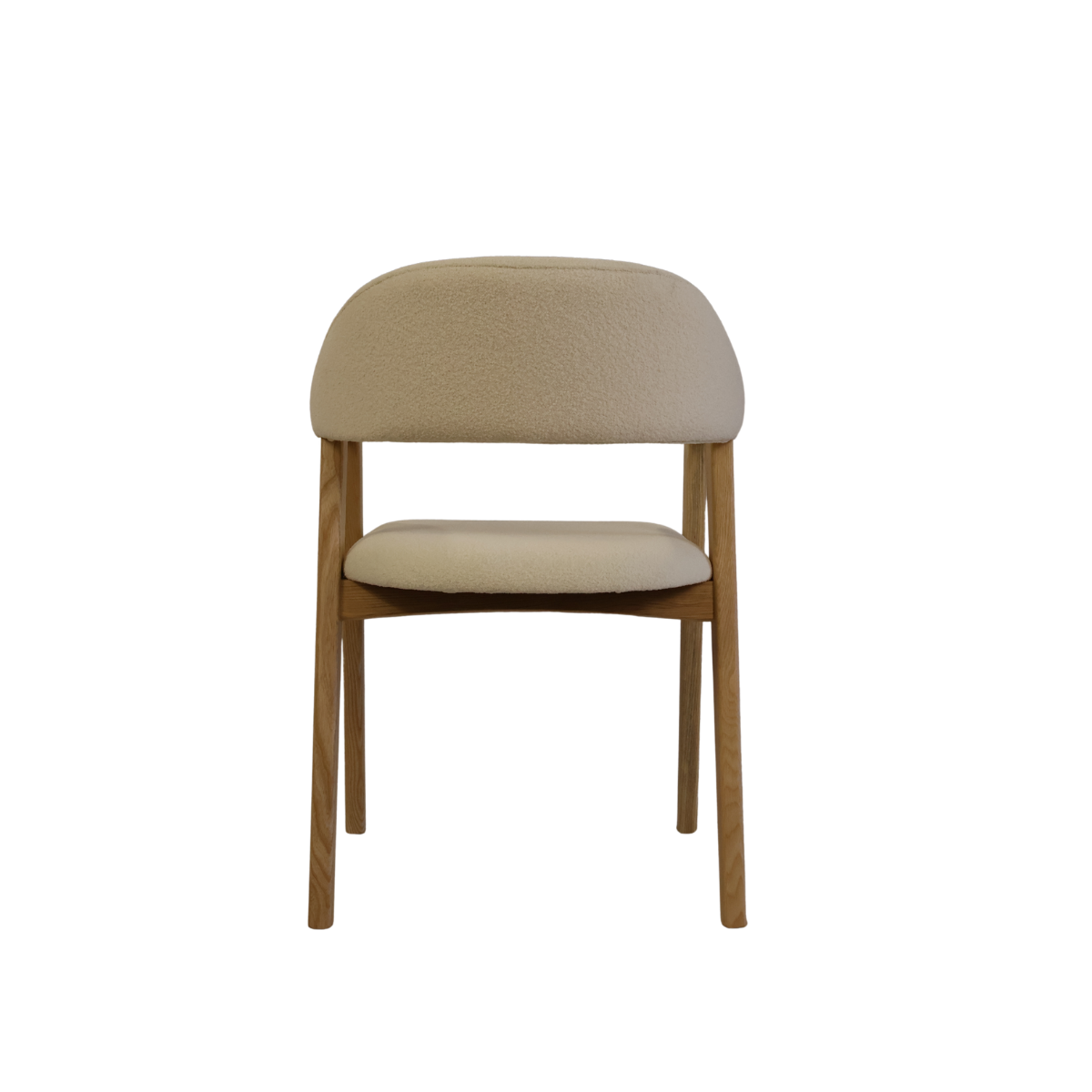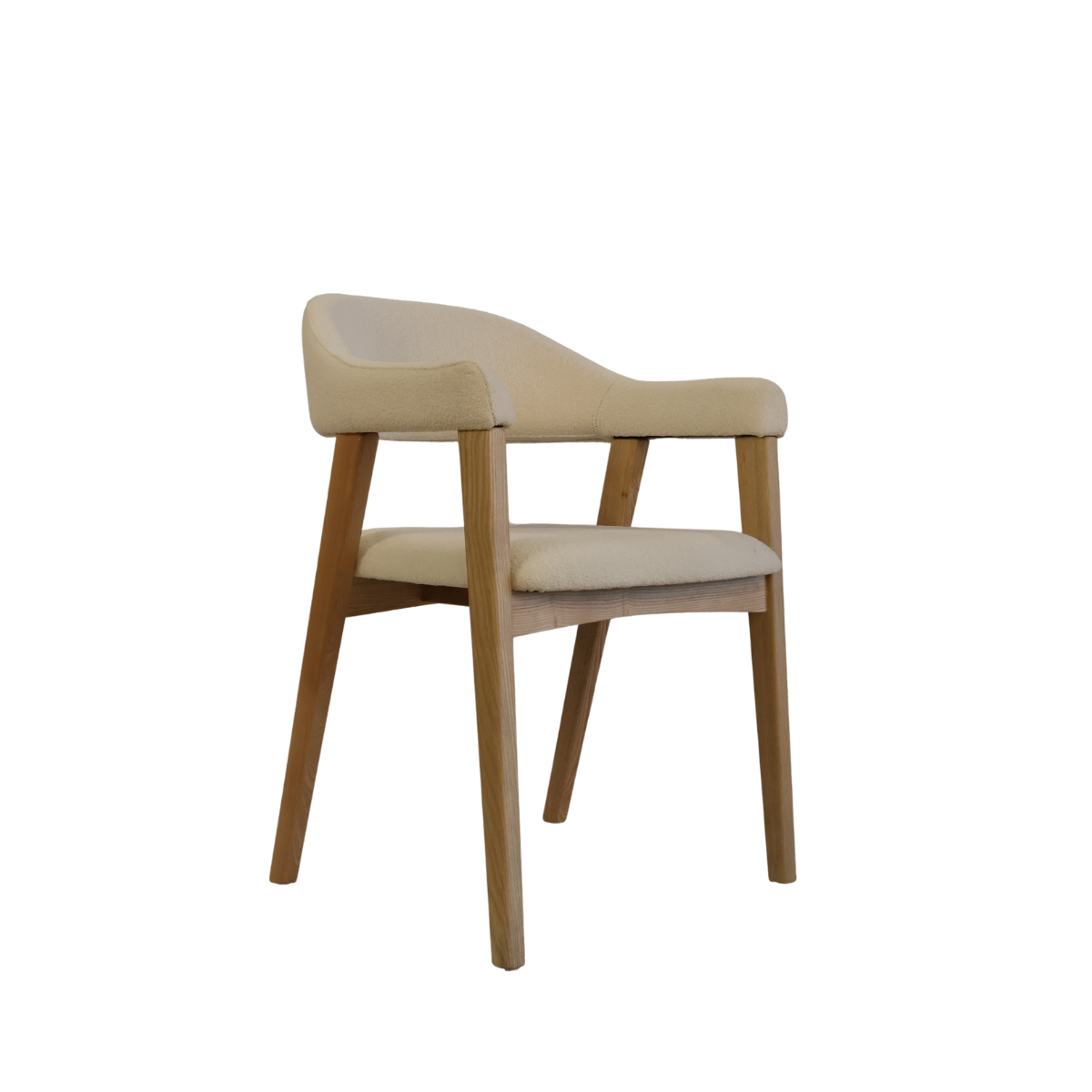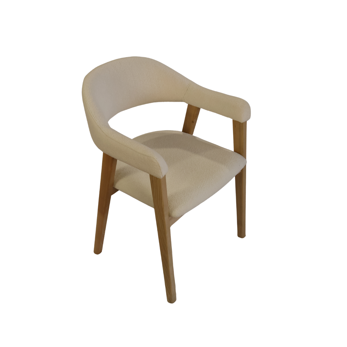 Fabricada em madeira de freixo à côr de carvalho e estofo bouclê branco.