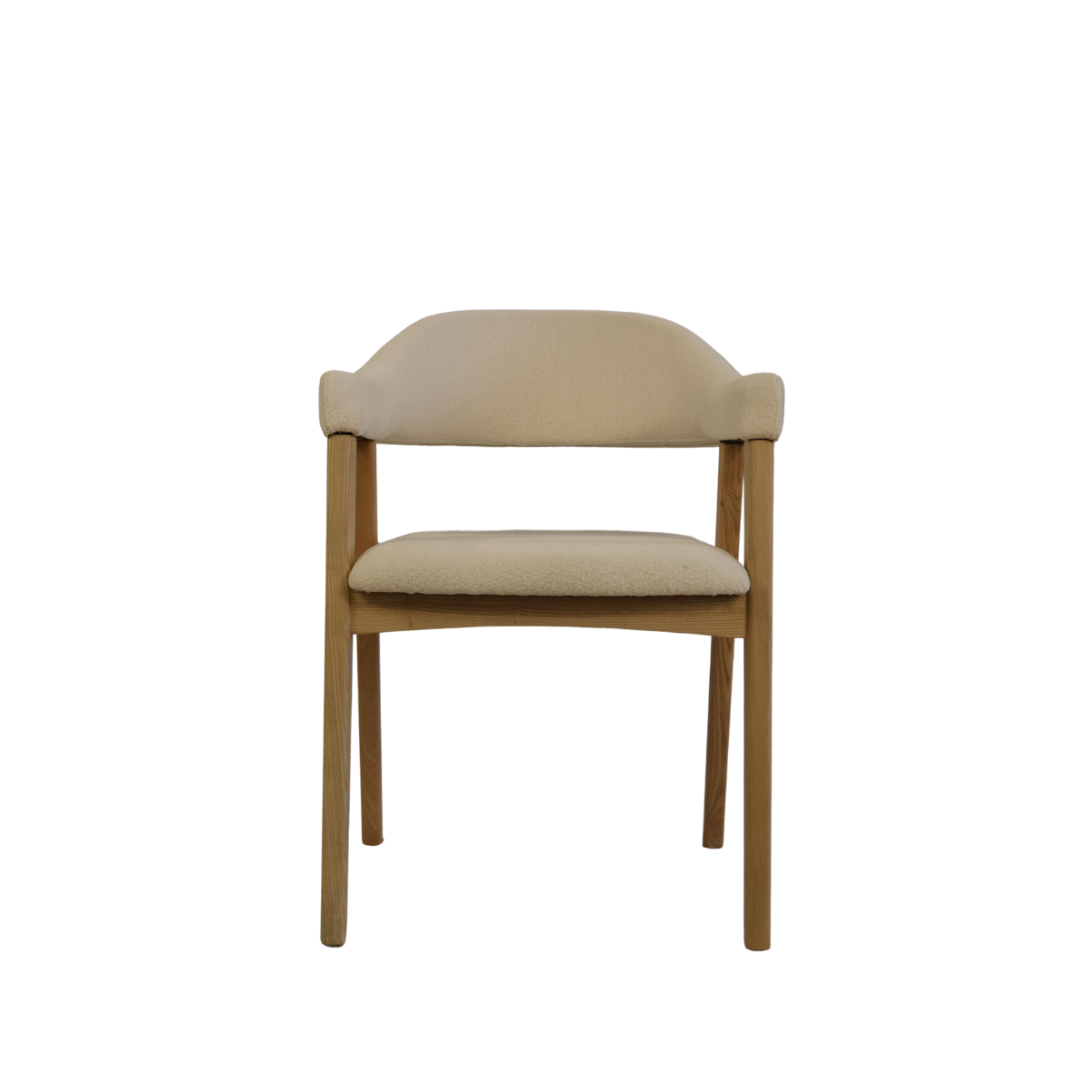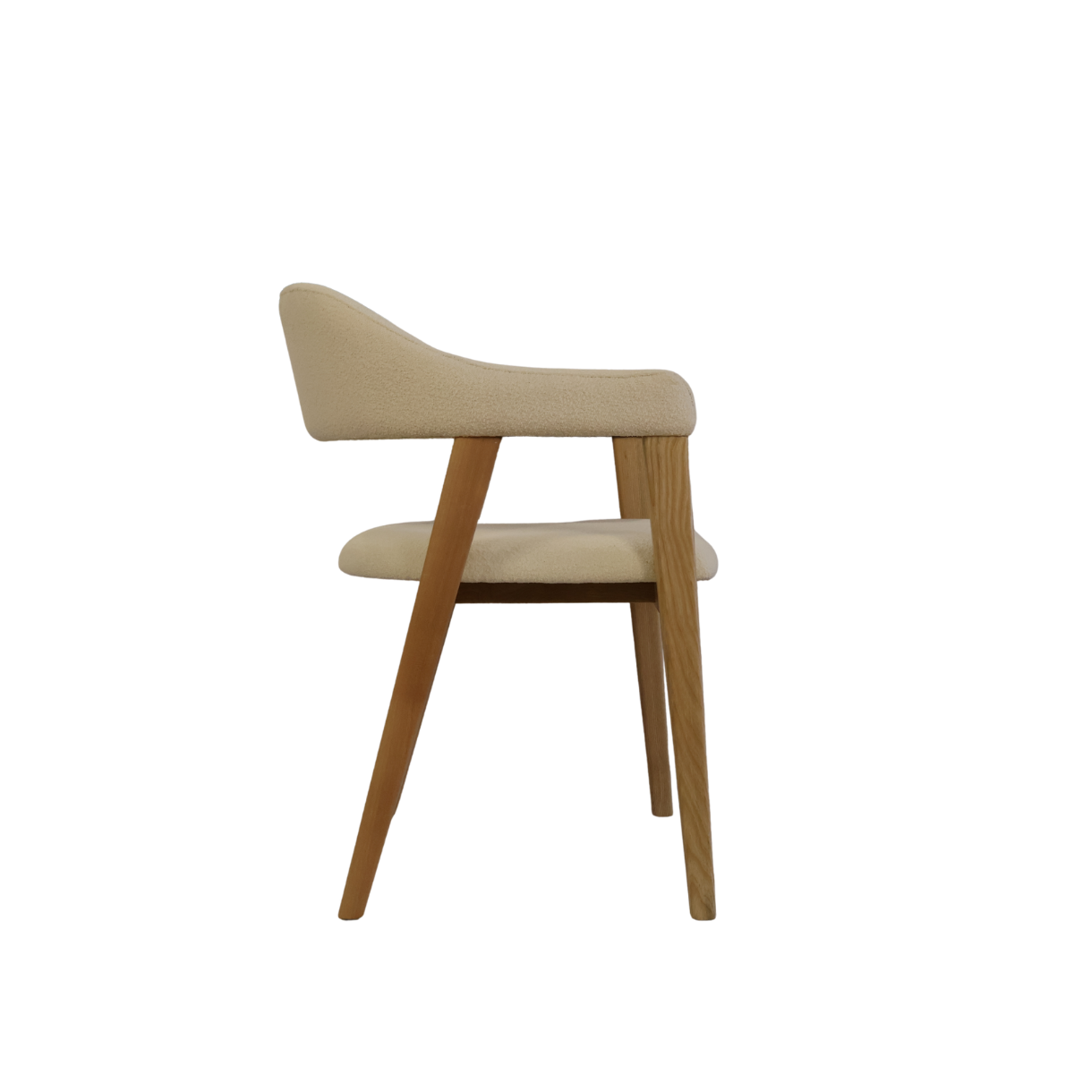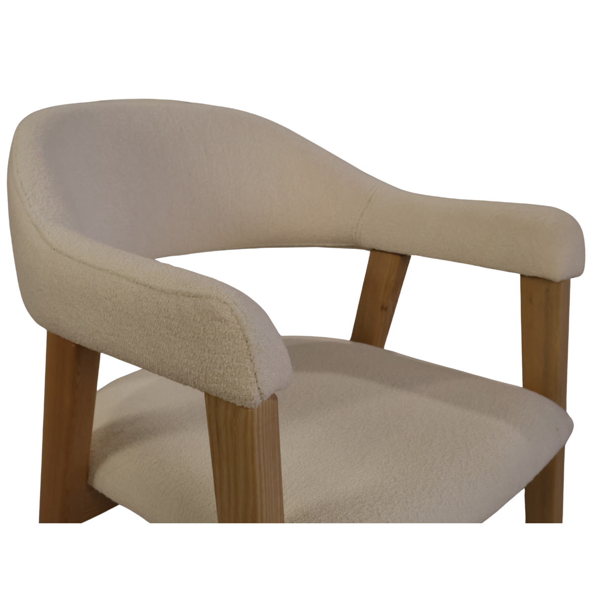 Fabricada em madeira de freixo à côr de carvalho e estofo bouclê branco.
