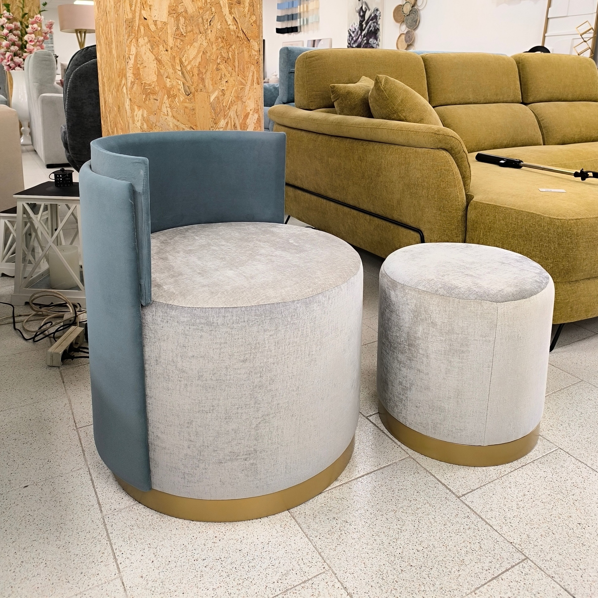 Home Cadeirões Cadeirão redondo com puff GP367116 -15% Cadeirão redondo com puff GP367116 SKU: 072141002 296,65 € 349,00 € Desconto de 15%. Comprar Contactar Adicionar à wishlist Cadeirão redondo com puff com estofo em microfibra azul e cinza e base em dourado. Dimensões cadeirão: Diâmetro 0.63m; Altura 0.70m. Dimensões puff: Diâmetro 0.40m; Altura 0.40m. Materiais e acabamentos: Estrura em madeira; Espuma; Estofo em microfibra. *Disponível no showroom. Campanha de saldos válida de 15 de Janeiro a 28 de Fevereiro de 2026, limitado ao stock existente. O artigo entregue será o que está na foto Tags Showroom Características Partilhar