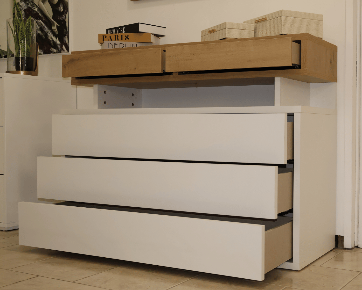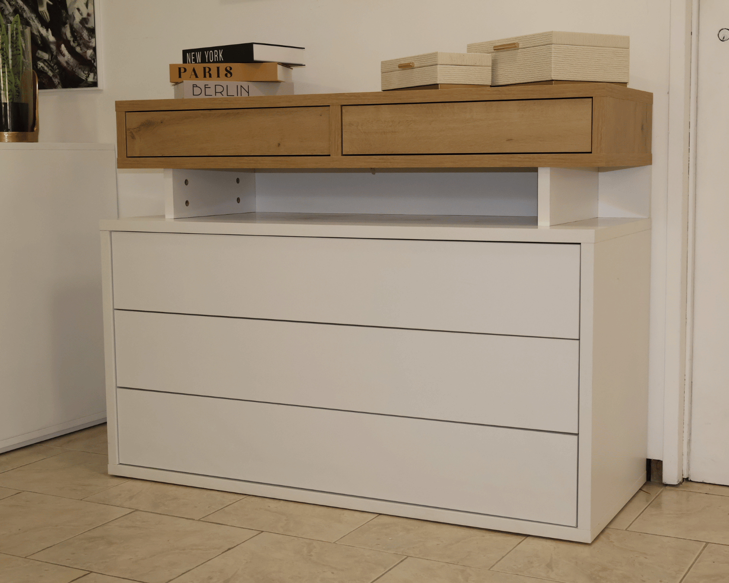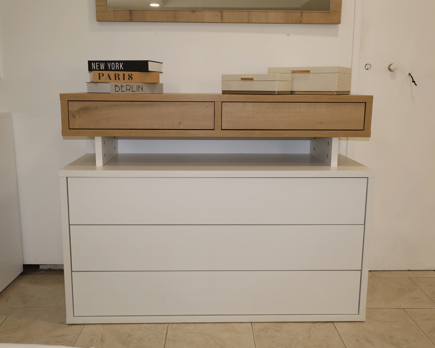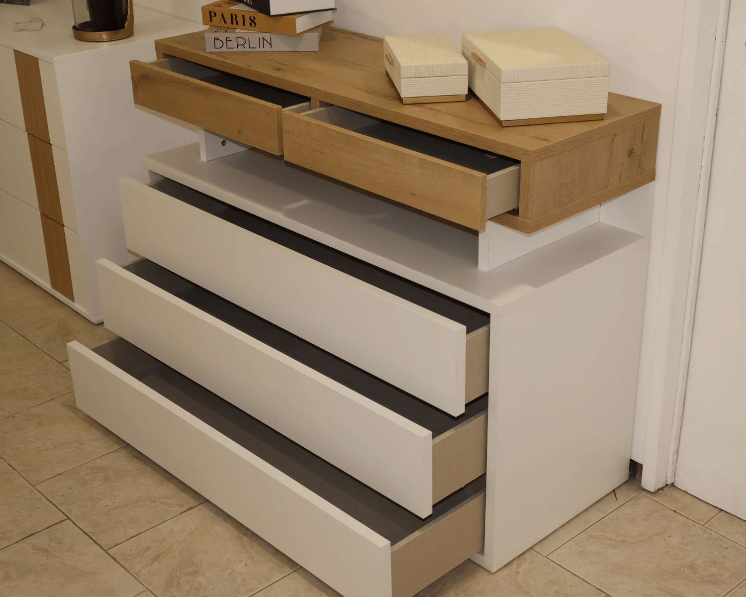 Home Cómodas Cómoda SWEET Cómoda SWEET SKU: 041005019 456,00 € Desconto de %. Comprar Contactar Adicionar à wishlist Cómoda de design moderno com gavetas espaçosas, ideal para manter o quarto organizado com estilo. Oferece uma solução prática de arrumação para roupa e acessórios, combinando funcionalidade e estética contemporânea. O design moderno permite integrar facilmente esta cómoda em diferentes ambientes de quarto. Dimensões: Comprimento: 1.20m; Profundidade: 0.48m; Altura: 0.90m. Materias e acabamentos: Melamina carvalho; Melamina branca. *Disponível no showroom. Partilhar