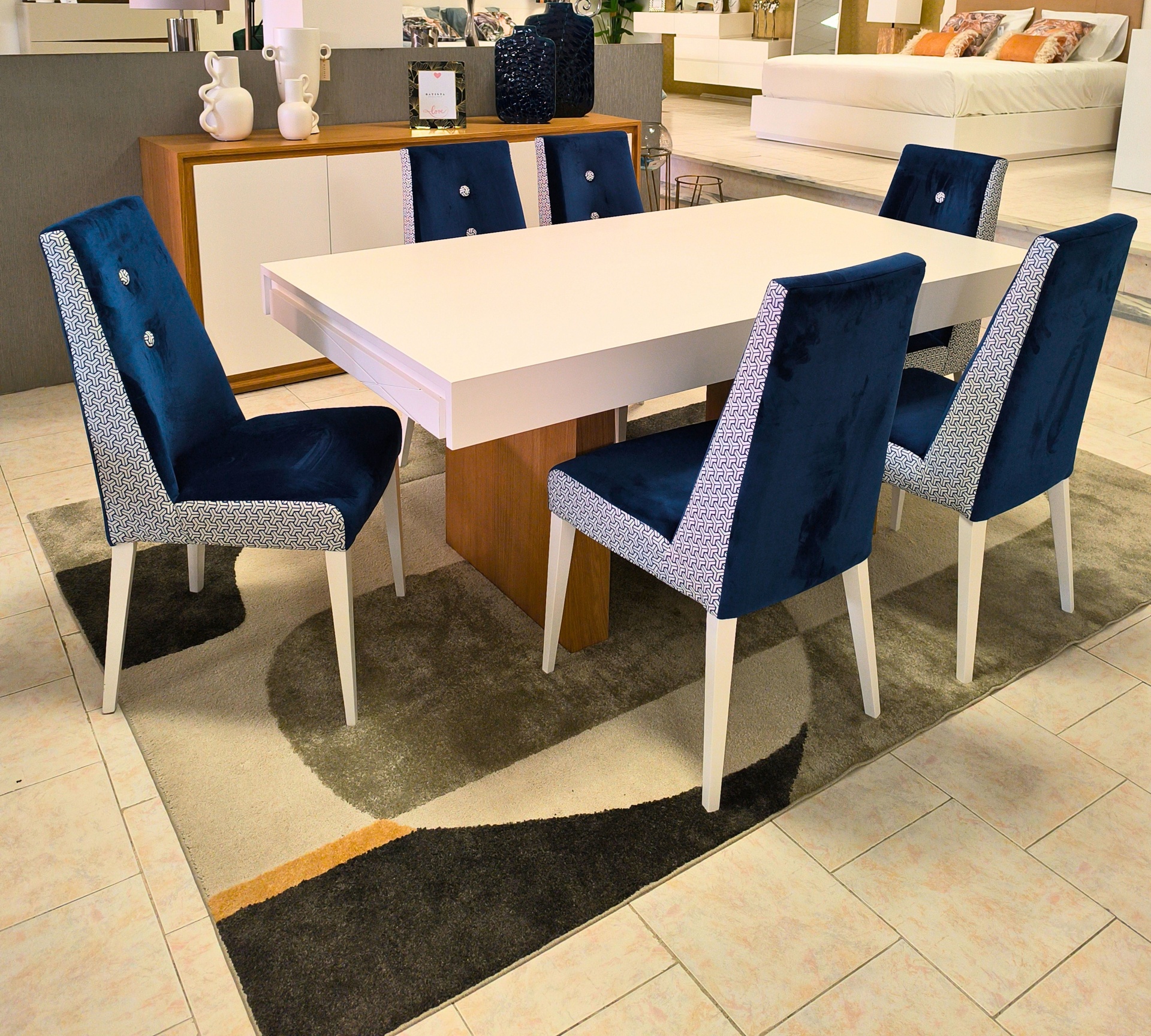 Conjunto de 6 cadeiras Veneceia, com estrutura em madeira maciça, pé em branco mate e conjugação de 2 tecidos, um liso e outro com padrão nas laterais e em 2 botões na costa.