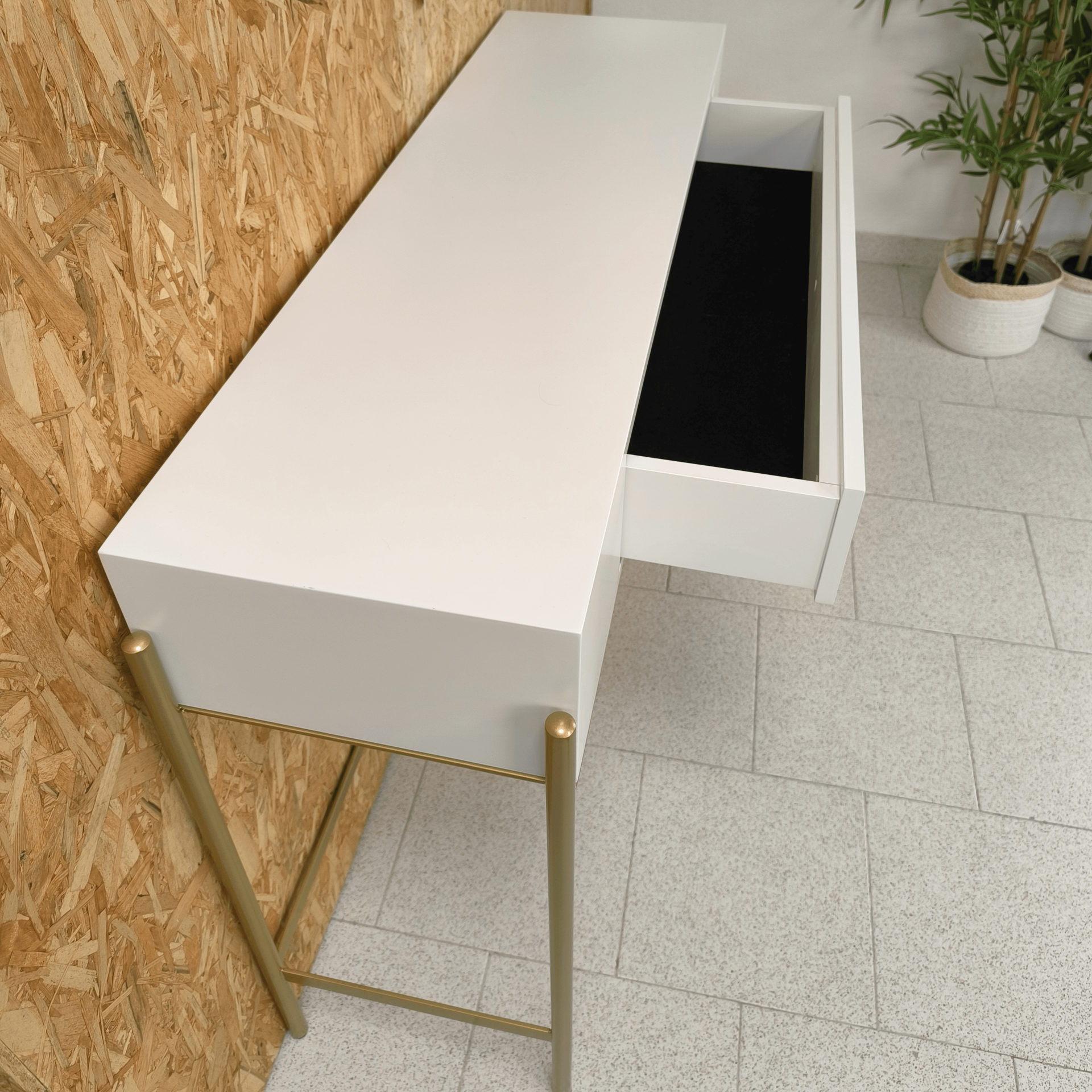 Home Consolas Consola Girassol Consola Girassol SKU: 069421002 620,00 € Desconto de %. Comprar Contactar Adicionar à wishlist Consola Girassol com pé metálico dourado e estrutura em lacado branco mate, com uma gaveta. Dimensões: 1.25m x 0.35m x 0.84m * Para outras cores ou revestimentos solicite orçamento. *Disponível no showroom. Partilhar