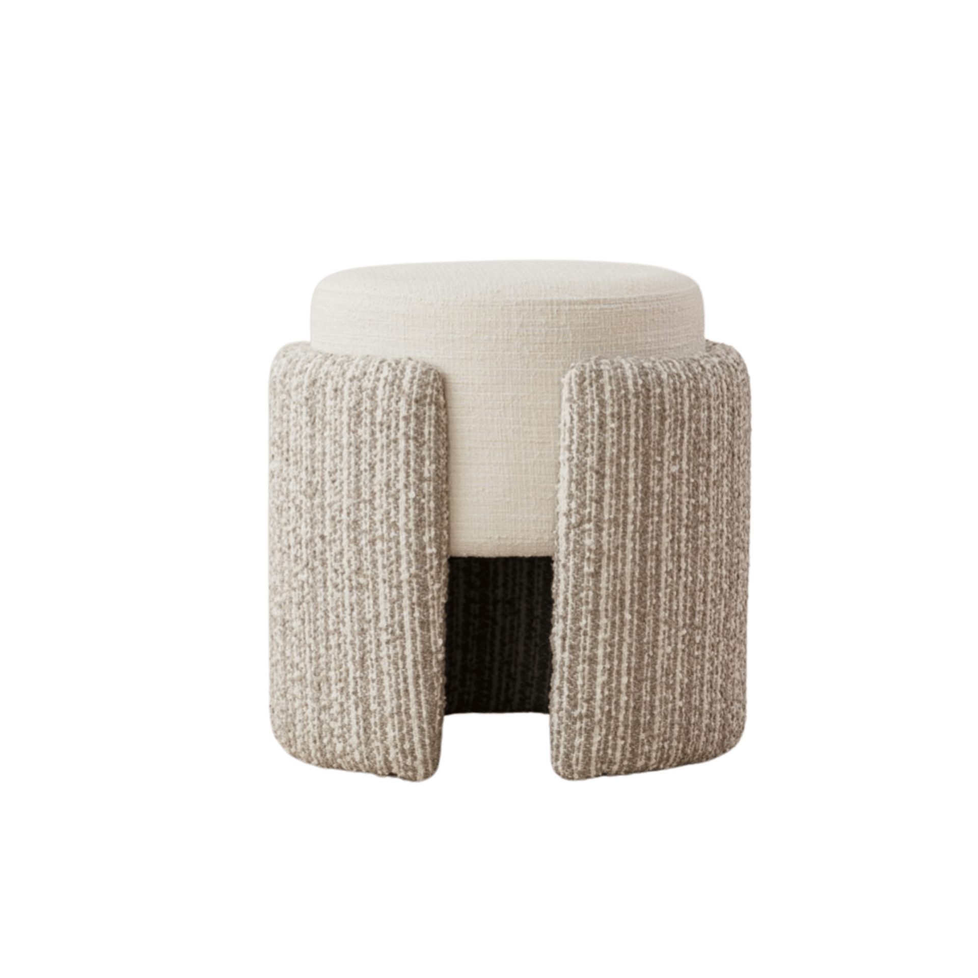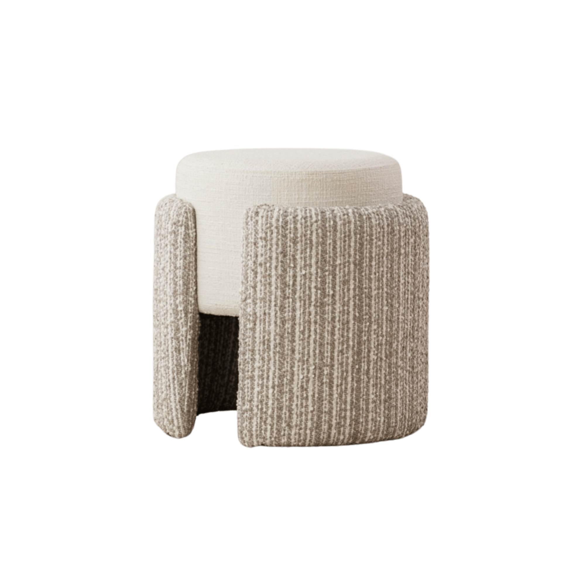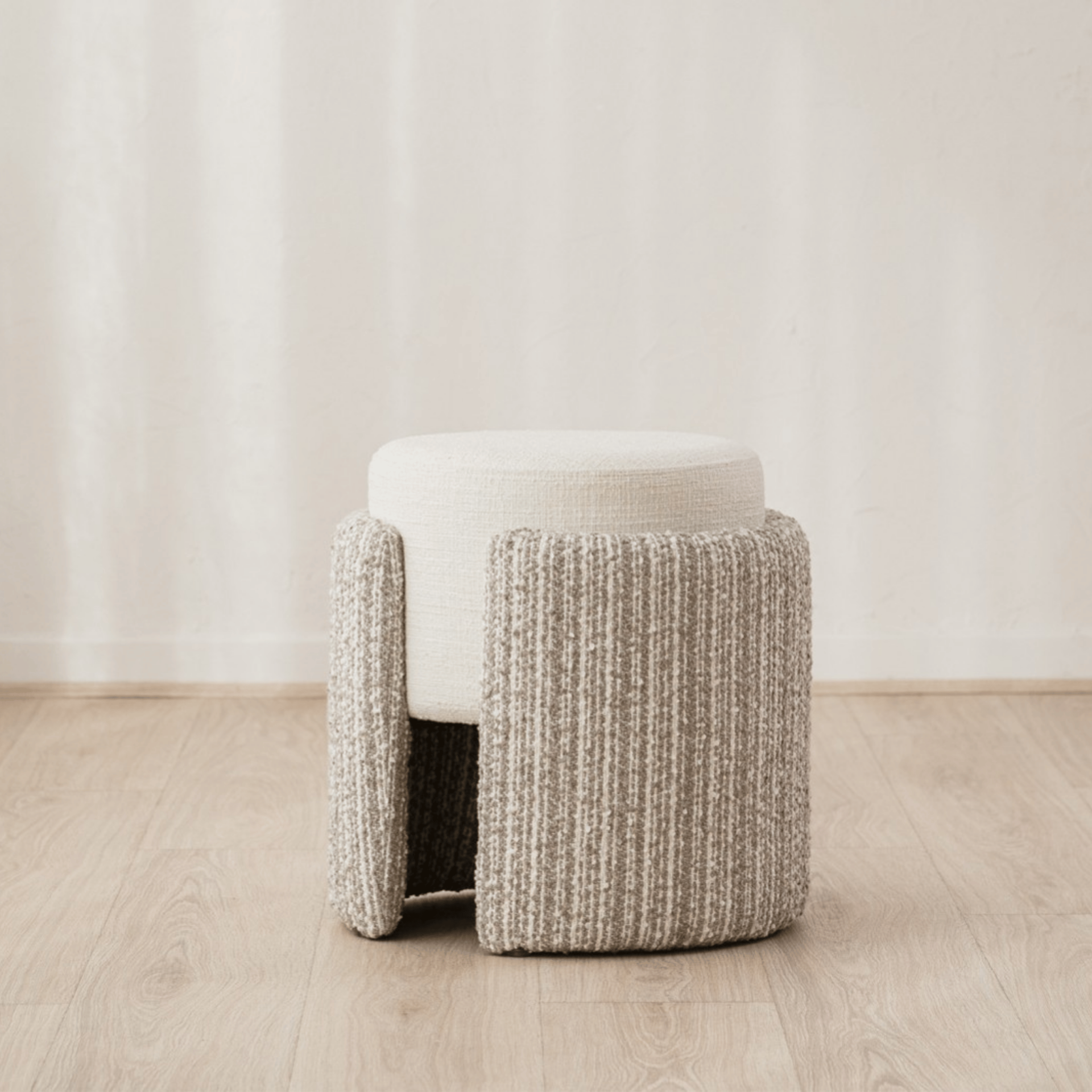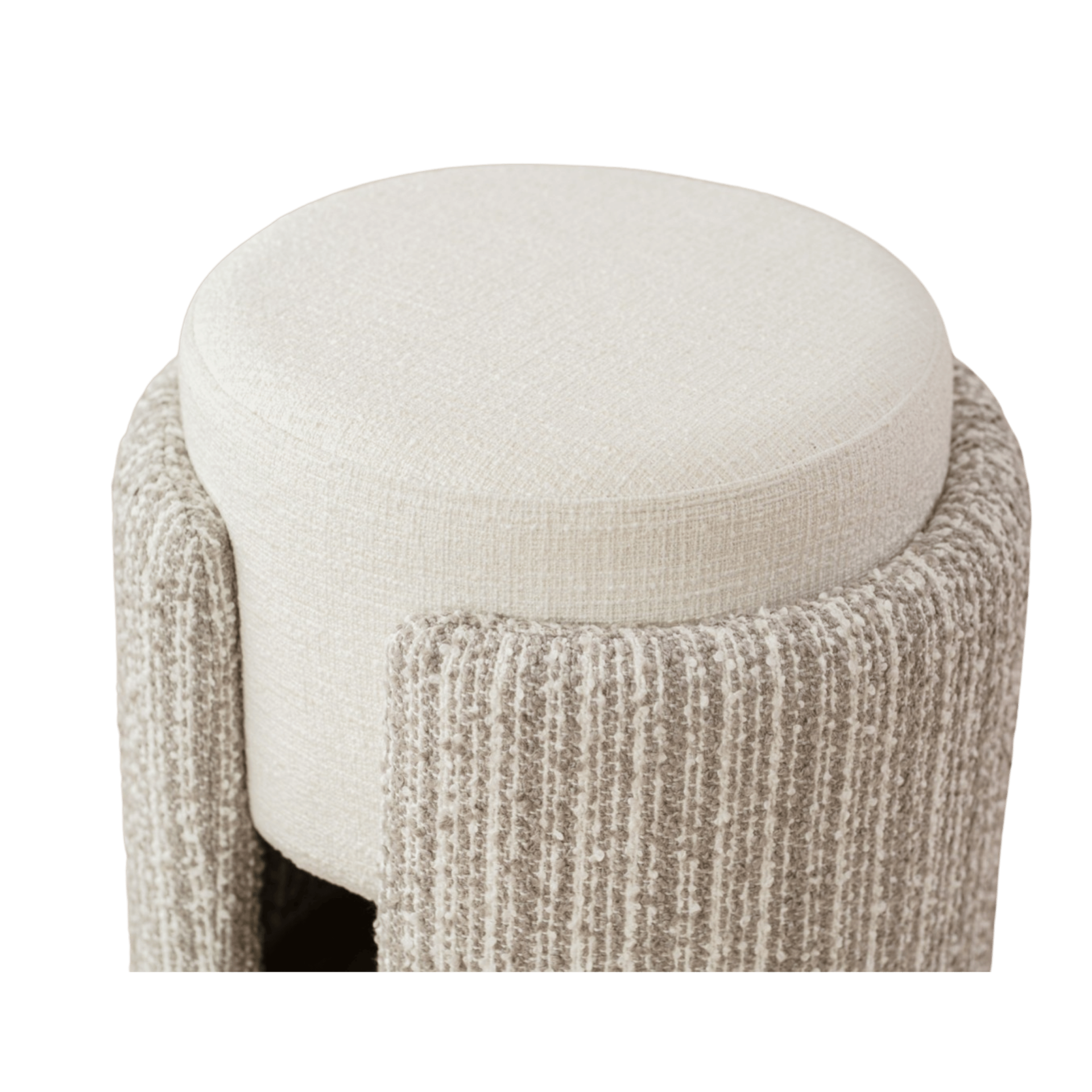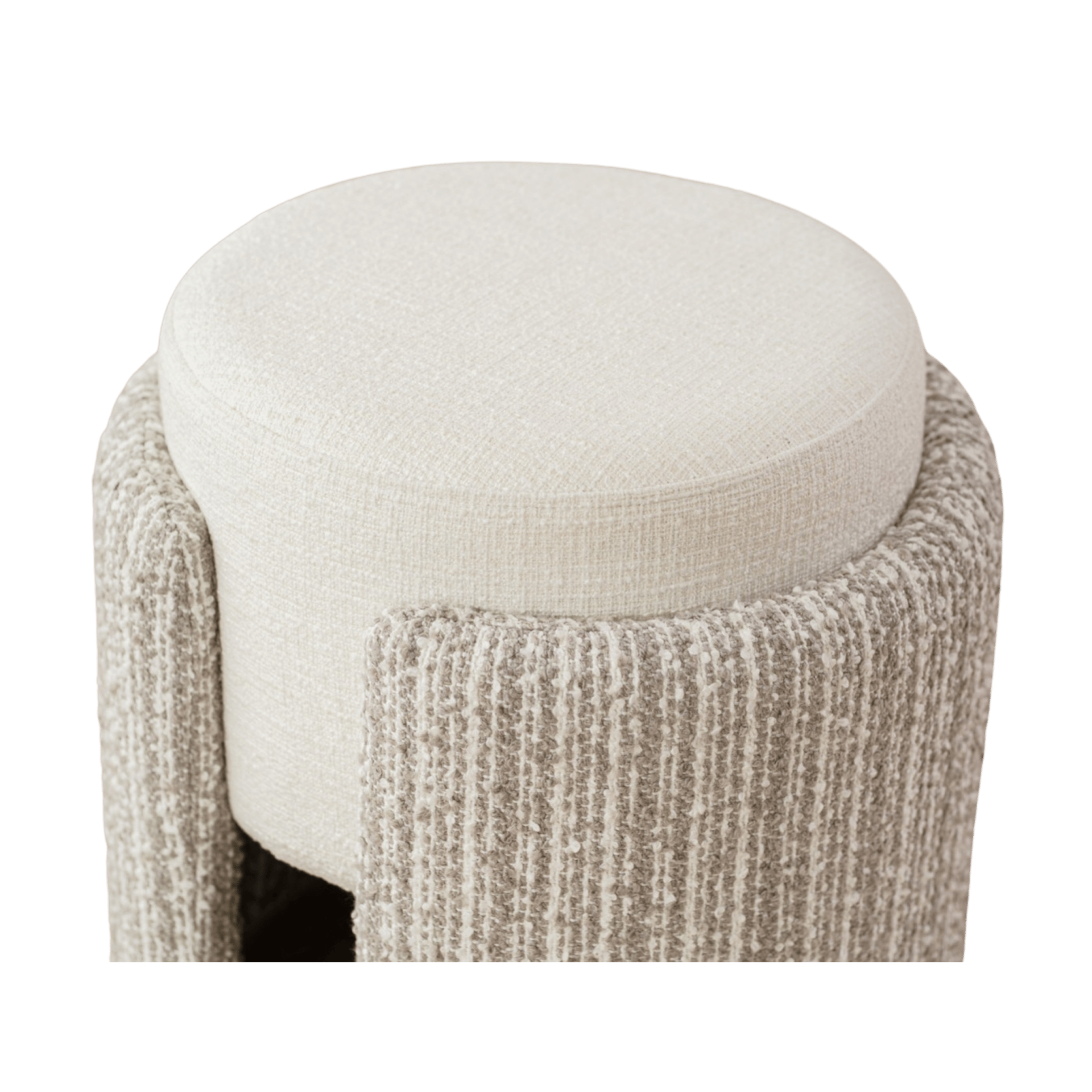 Tons de pedra e cinza. Com seu formato arredondado, o pufe Minia possui um design de duas camadas, onde o assento é revestido por uma camada externa. Para este modelo, foi escolhido um estofamento texturizado em tons de pedra para o assento, complementando perfeitamente o tecido mais espesso e estampado em tons de cinza e pedra usado na camada externa. Esses pufes são a peça perfeita para completar a decoração de qualquer ambiente.