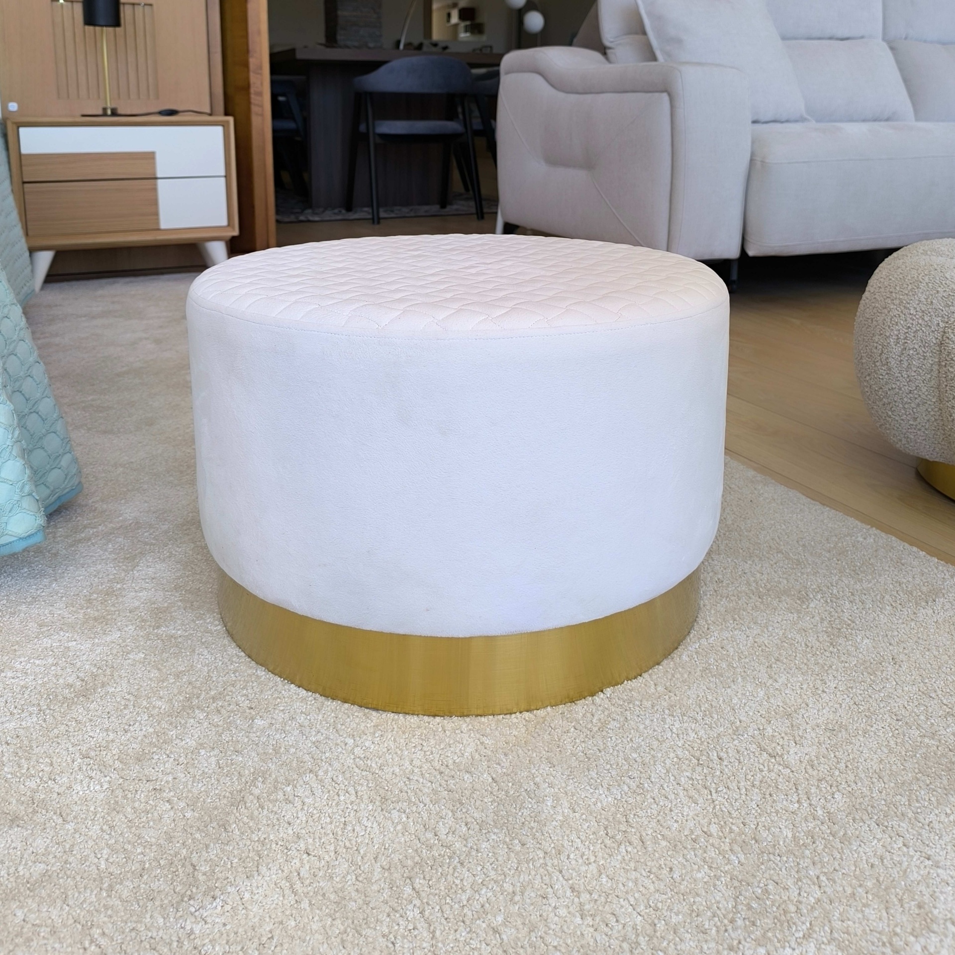 Home Puffs Puff ref. 49420 Puff ref. 49420 SKU: 071677001 123,00 € Desconto de %. Comprar Contactar Adicionar à wishlist Puff em tom creme com rodapé em dourado. Dimensões: Diâmetro 0.55m Altura 0.35m. *Disponível no showroom Tags Showroom Características Partilhar