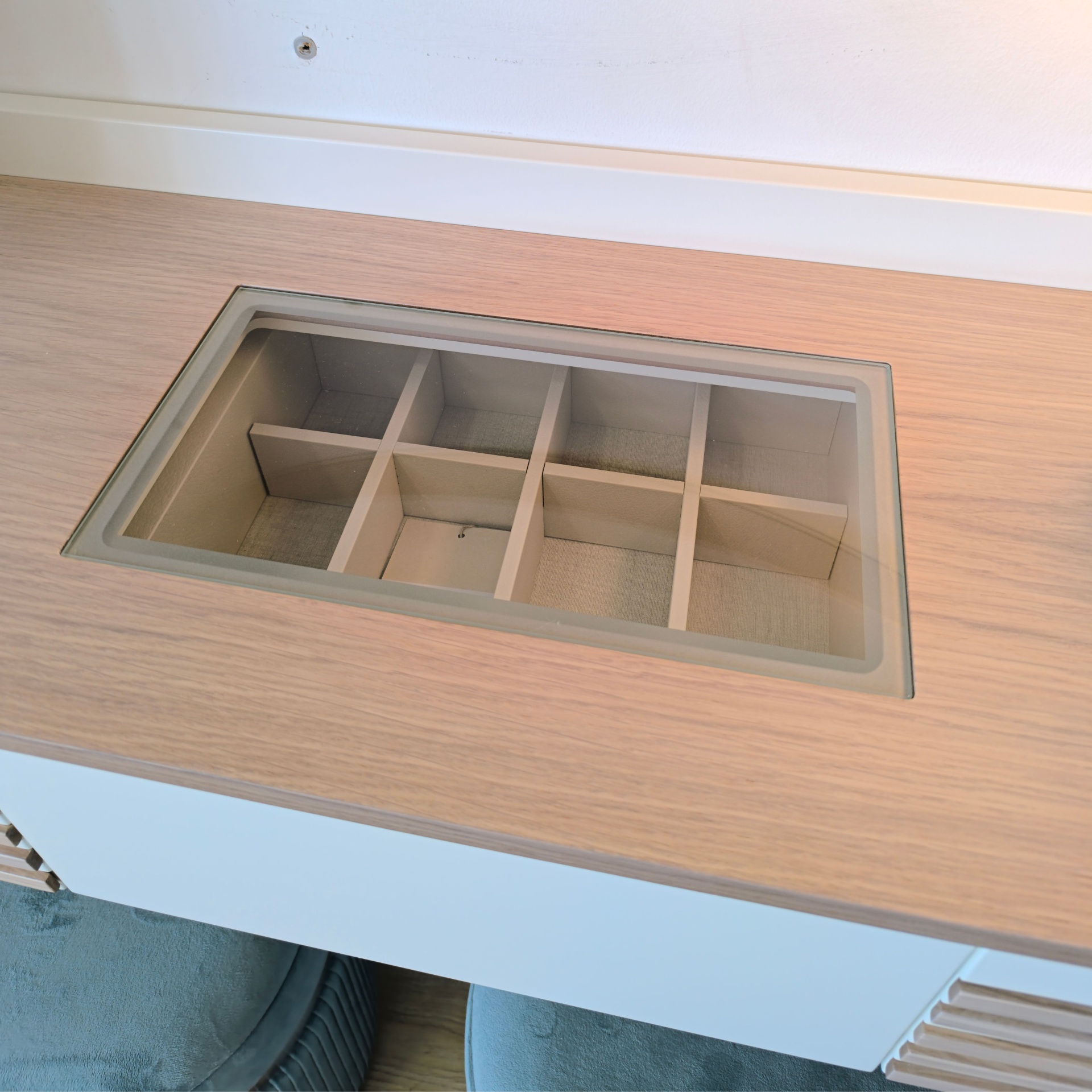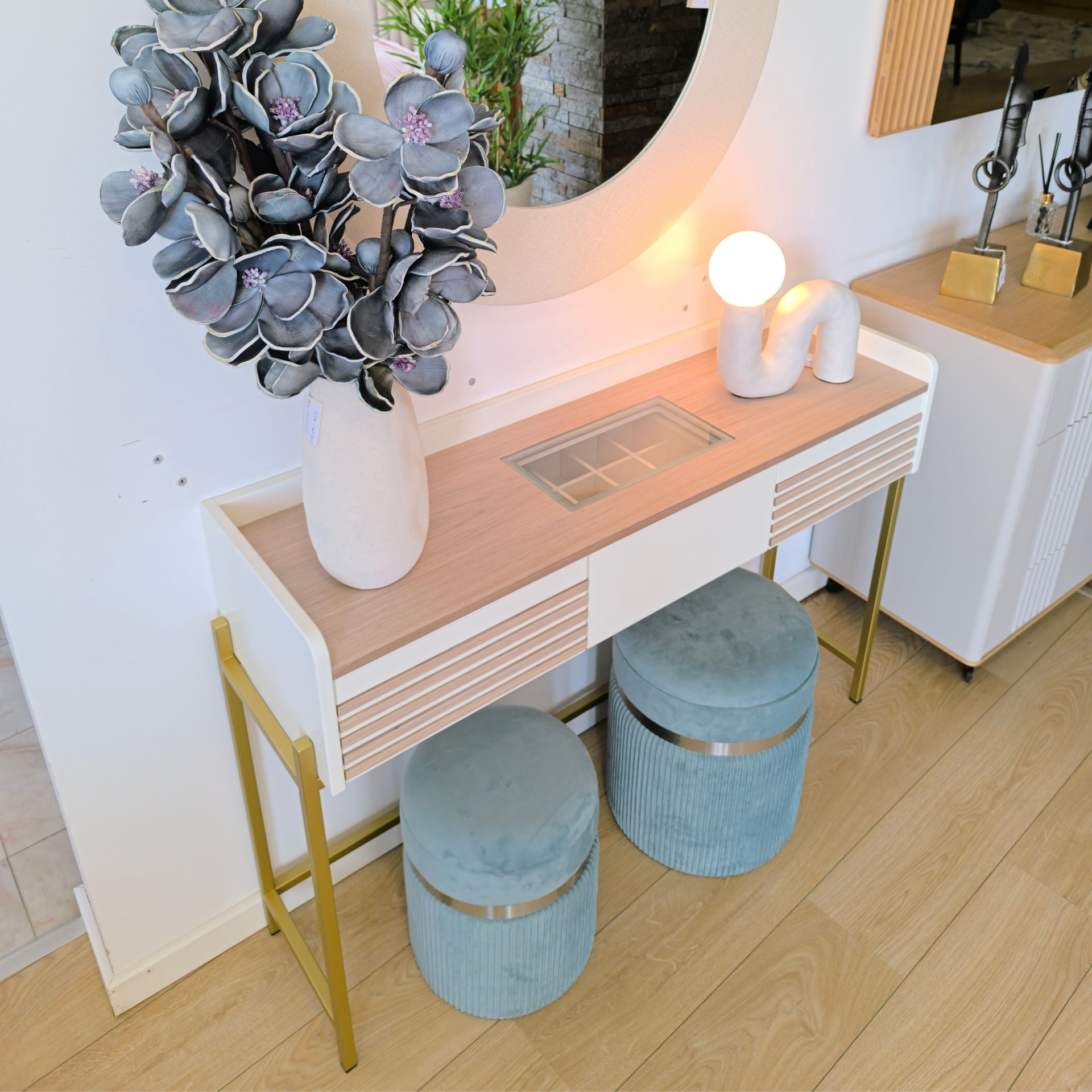 O toucador Noa foi idealizado muito além da funcionalidade, combinando um design a que ninguém fica indiferente. Vem equipado com 3 gavetas, uma delas com  divisões e vidro por cima,